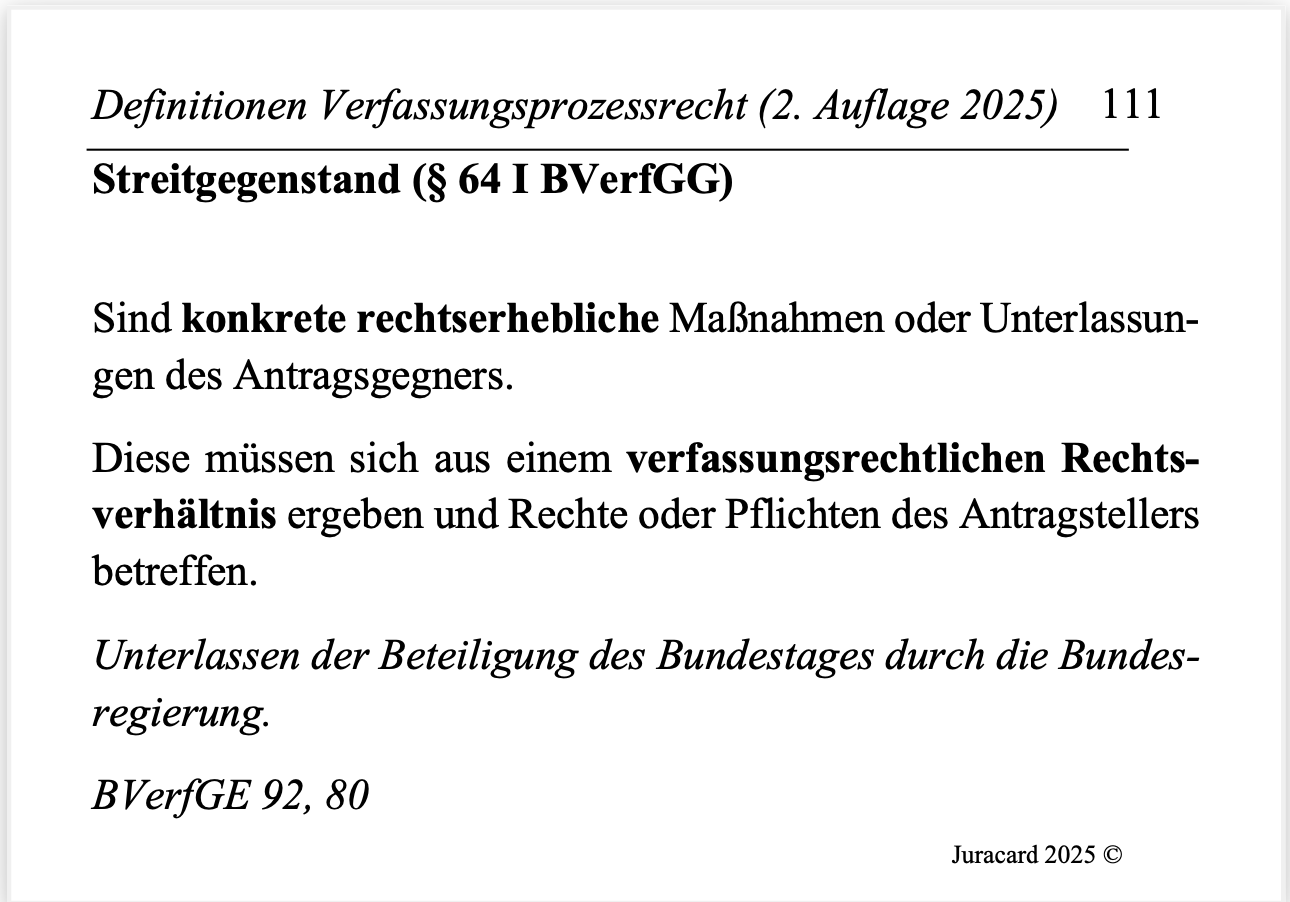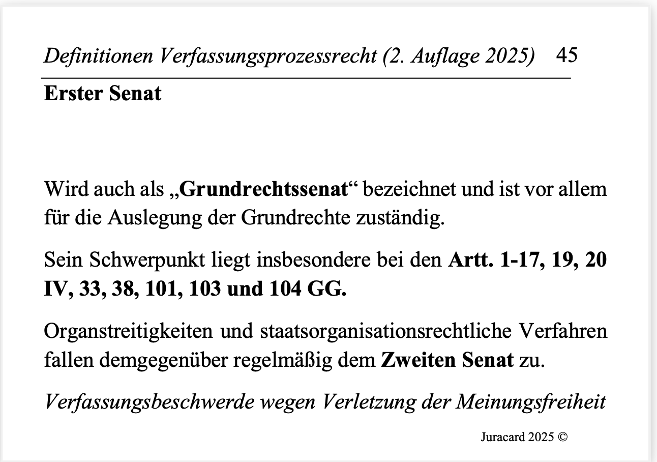 Meistere das Verfassungsprozessrecht mit 113 zentralen Definitionen und Begriffen – alphabetisch geordnet von A wie A-Limine-Abweisung (§ 24 BVerfGG) bis Z wie Zweiter Senat. Die Karten enthalten eine präzise Begriffserklärung, ein anschauliches Beispiel und passende Rechtsprechung – perfekt für eine fundierte Vorbereitung auf Klausuren und das Examen.
