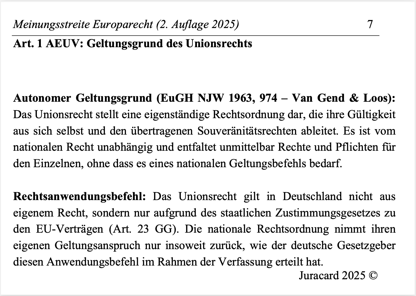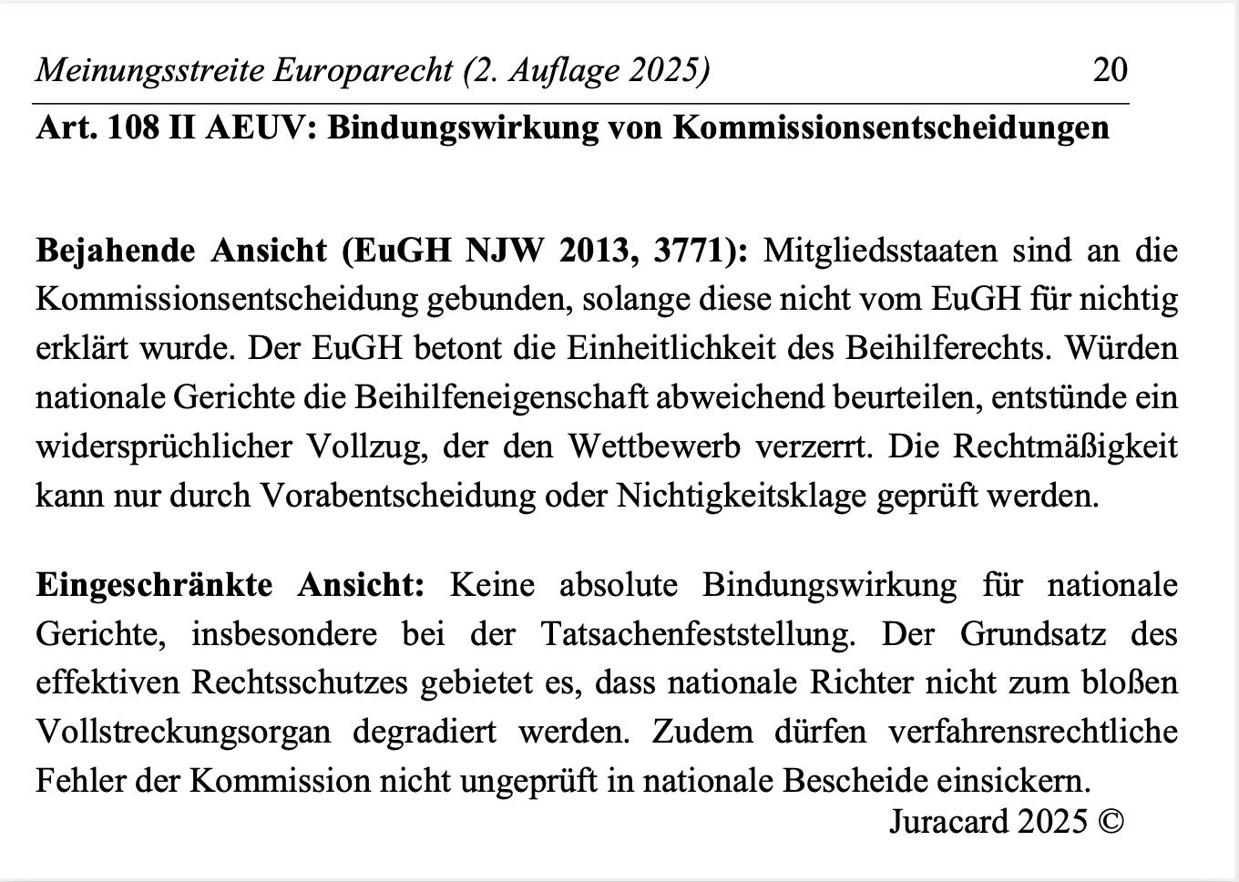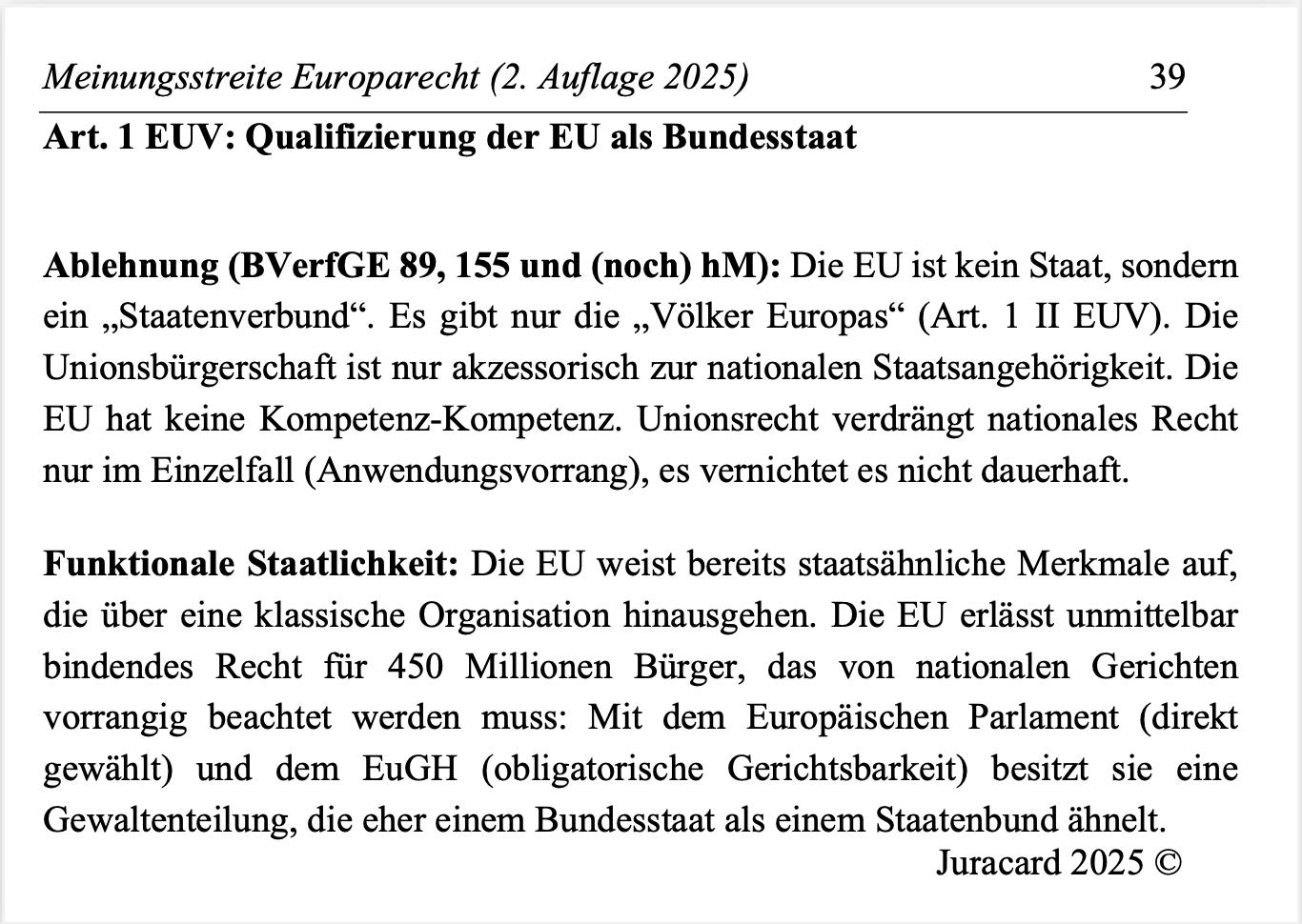 Lerne die wichtigsten Streitfragen des Europarechts – kompakt und verständlich dargestellt. Diese Sammlung enthält 50 zentrale Meinungsstreitigkeiten zwischen Literatur und Rechtsprechung, klar strukturiert für die gezielte Vorbereitung auf Klausuren und das Examen.