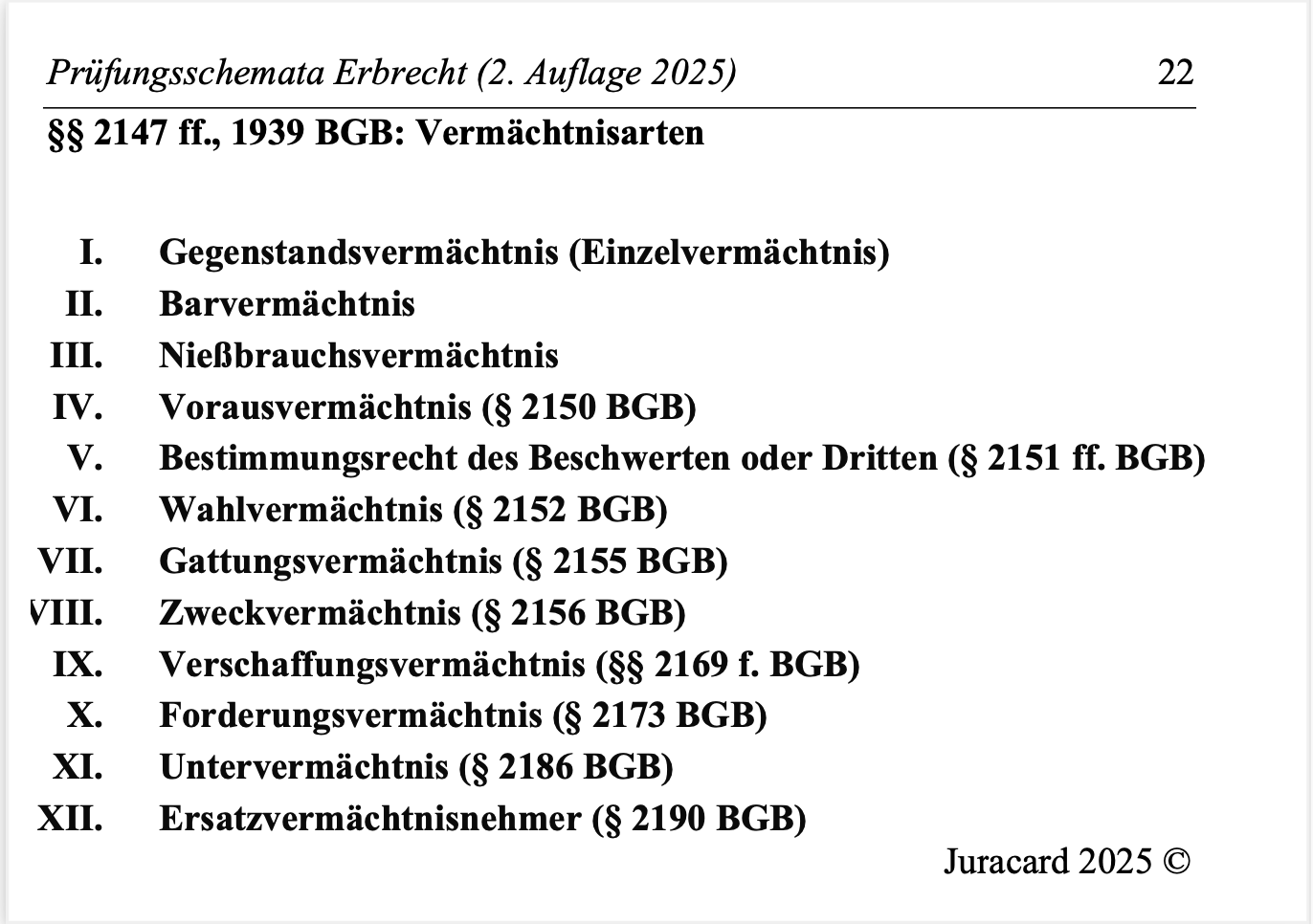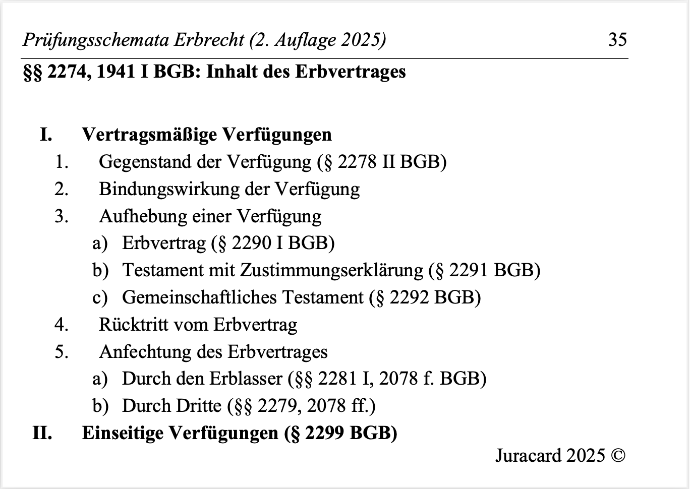 Diese Sammlung enthält die 41 Prüfungsschemata zu den wichtigsten Problemen des Erbrechts . Die Schemata sind numerisch aufsteigend geordnet, übersichtlich und auf den Klausurgebrauch zugeschnitten.