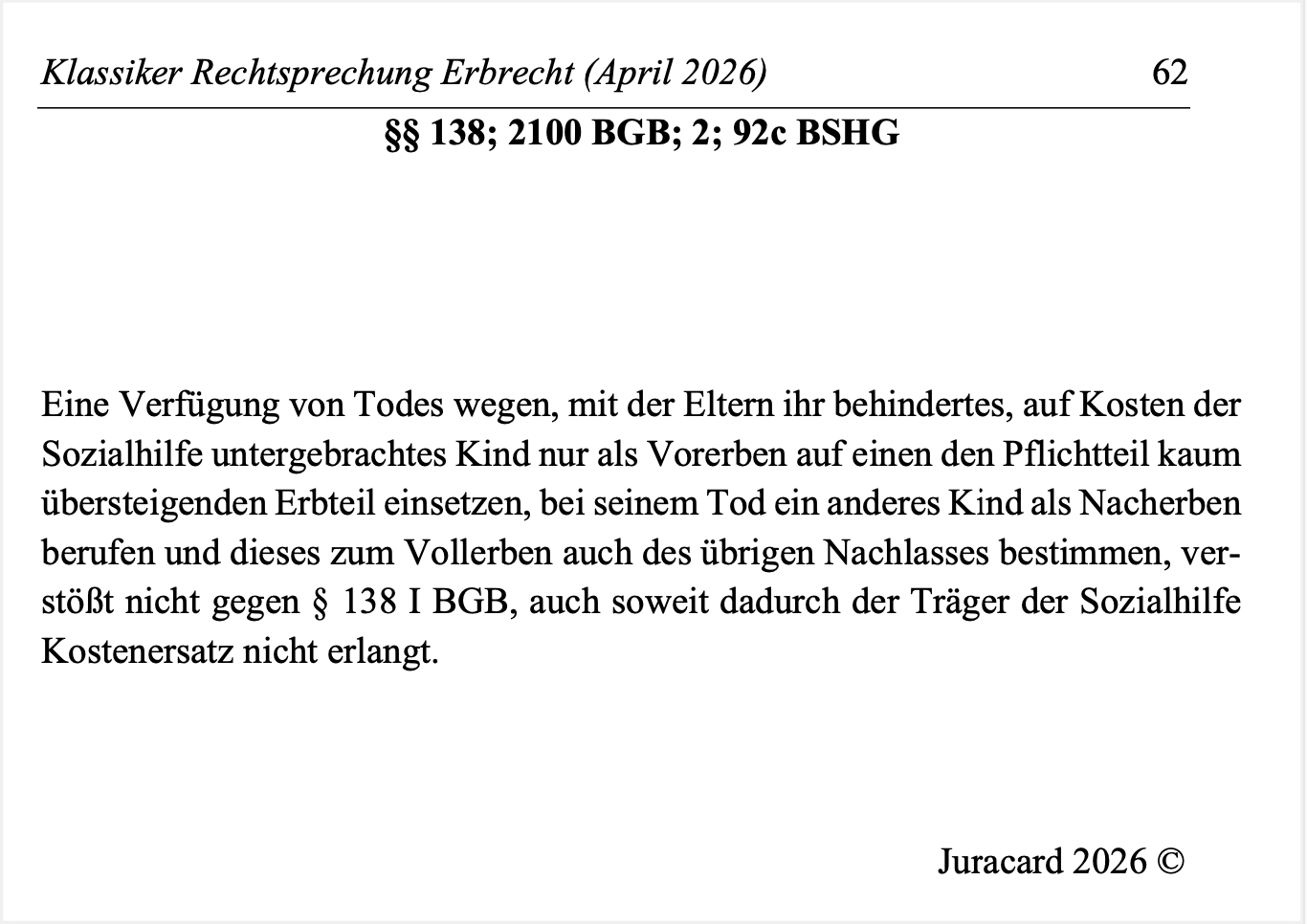 Lerne die wichtigsten Entscheidungen zum Erbrecht von Anfängen des Reichsgerichts bis zu den prägenden Urteilen des BGH! Diese Datei enthält 40 examensrelevante Urteile – kompakt aufbereitet für eine gezielte und effektive Examensvorbereitung.