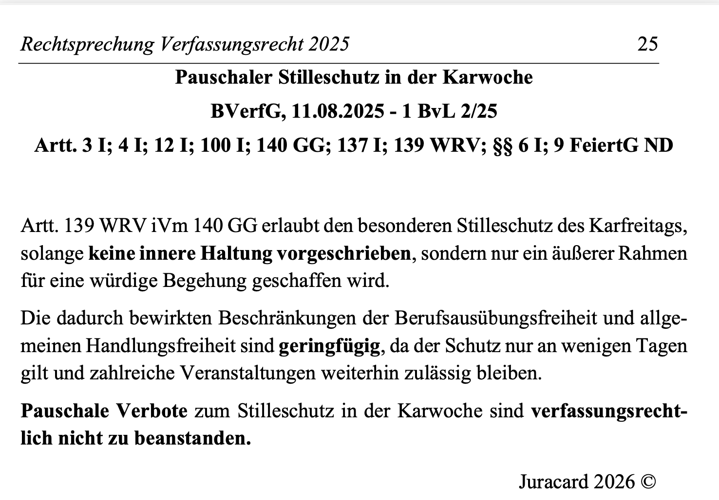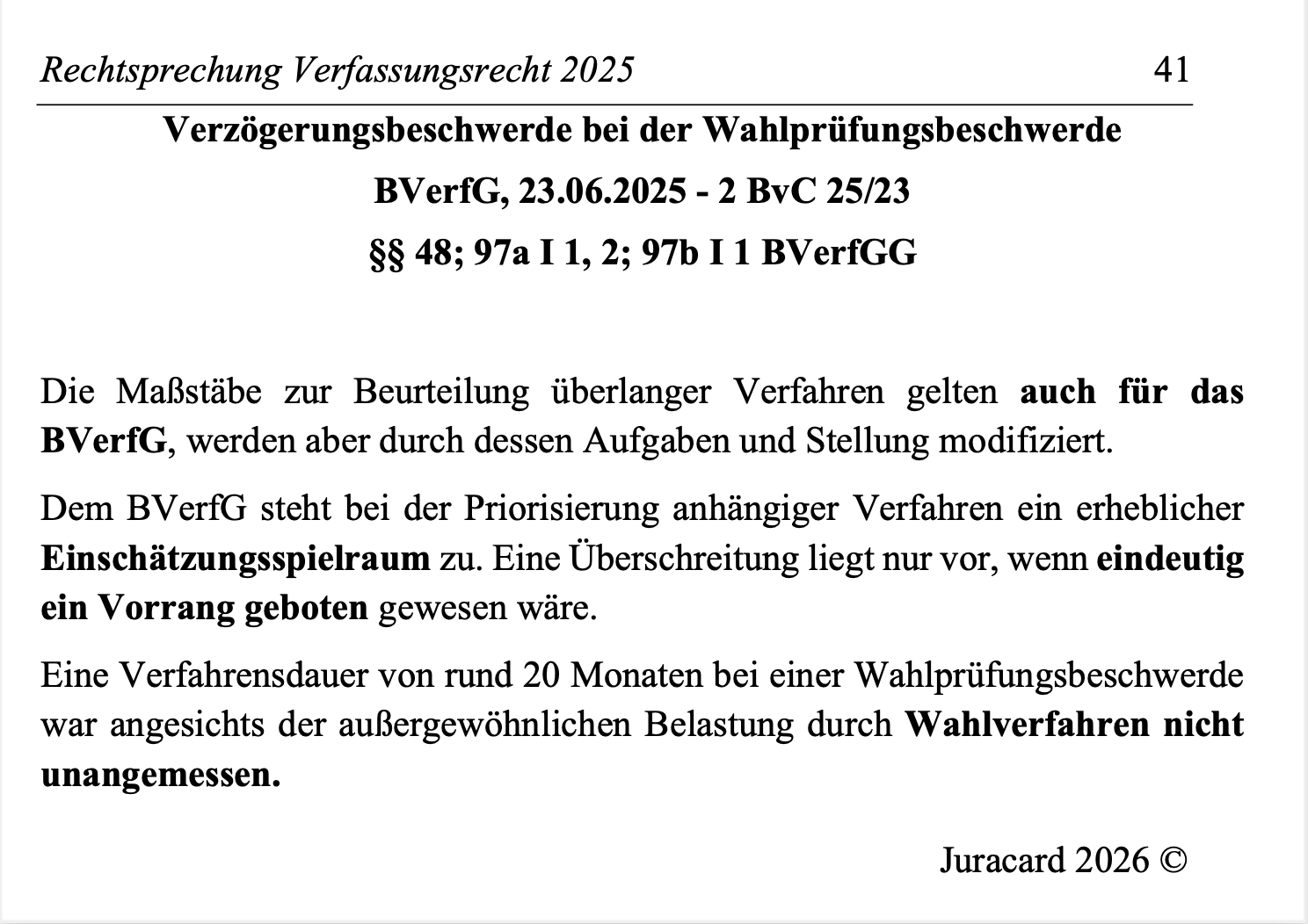 Diese PDF und Anki-Datei enthält die 74 aus meiner Sicht klausur- und examensrelevantesten Entscheidungen aus dem Verfassungsrecht (Grundrechte und Staatsorga) aus 2025 – kompakt aufbereitet und ideal zum Lernen.